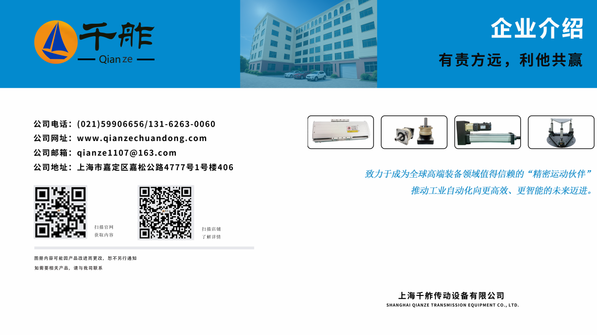 上海千舴傳動設備有限公司专注于高性能传动执行系统的研发与制造,主营产品包括伺服電動缸、直线模组与行星减速机三大类,广泛应用于工业自动化、智能装备、精密制造等领域。公司産品涵盖多种结构与规格,具备高精度、高推力、响应快、安装便捷等特点,并支持非标定制,致力于为客户提供高效、可靠的线性传动解决方案。