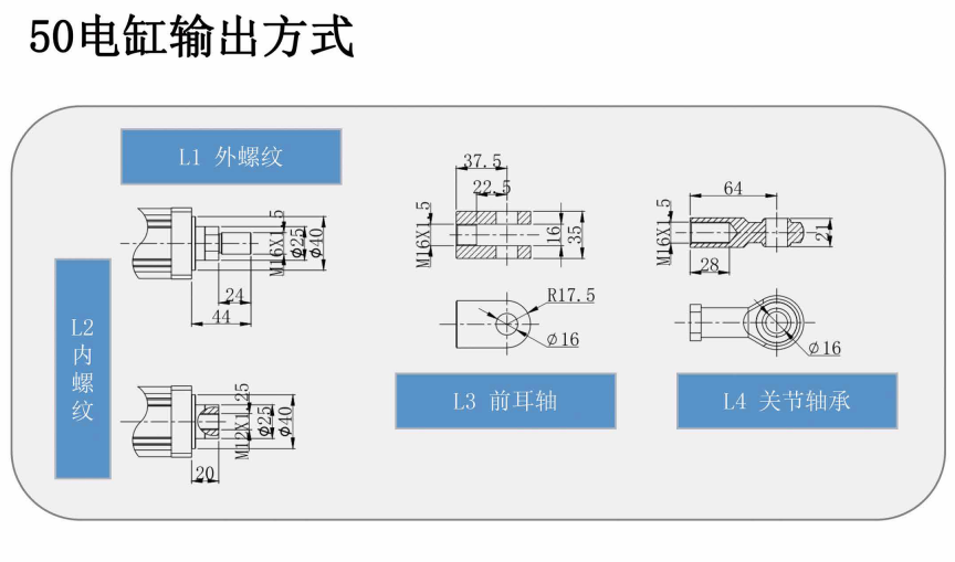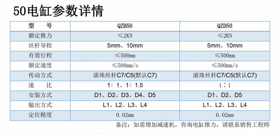 在結構配置方面,QZ50系列提供多種導程(5mm、10mm)和速比選項(1:1、1:1.5),標准搭載C7級滾珠絲杆,並可根據精度要求升級至C5級,確保整機運行精准穩定。安裝方式靈活多樣,涵蓋前法蘭、腳式安裝、後耳軸、後法蘭及中部耳軸等形式,輸出端亦支持外螺紋、內螺紋、銷耳軸與關節軸承等連接方式,便于與多種設備及機構接口集成。定位精度方面,標准配置爲±0.02mm,精度等級亦可根據應用需求選擇普通級(P2)或精良級(P1),廣泛滿足不同行業對運動控制精度的多樣化需求。